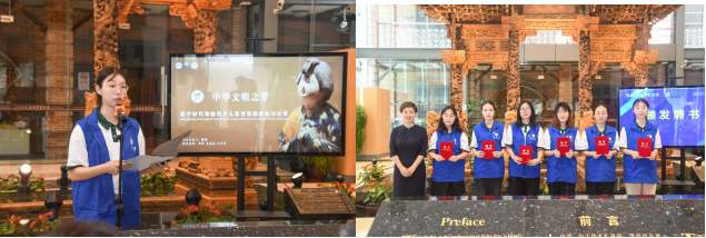 學(xué)院“中華文明之芽”學(xué)生團(tuán)隊(duì)負(fù)責(zé)人薛晴代表志愿者對(duì)土山灣博物館提供的實(shí)踐平臺(tái)進(jìn)行感謝并作項(xiàng)目介紹。土山灣博物館副館長(zhǎng)金志紅為志愿者團(tuán)隊(duì)頒發(fā)聘書(shū)。