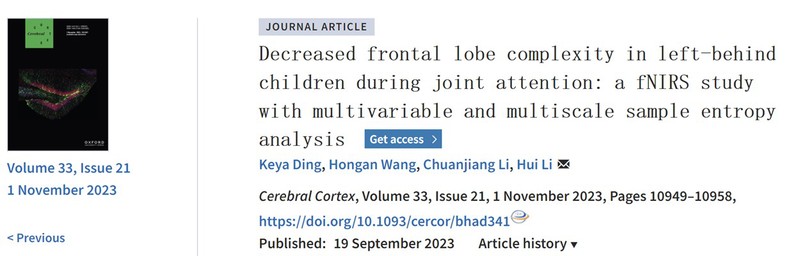 Ding, K., Wang, H., Li, C., & Li, H. (2023). Decreased frontal lobe complexity in left-behind children during joint attention: a fNIRS study with multivariable and multiscale sample entropy analysis. Cerebral Cortex, 33(21), 10949-10958. https://doi.org/10.1093/cercor/bhad341