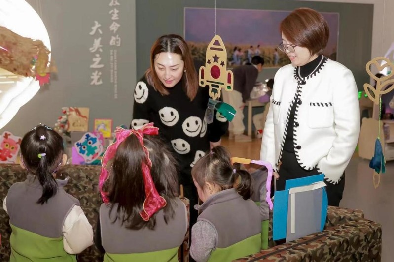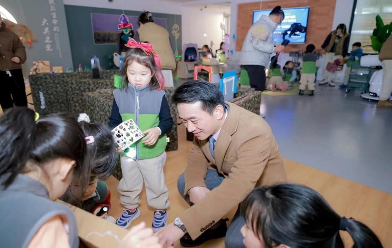 姚春玲園長與青浦區(qū)教育局基礎(chǔ)教育科幼教段負(fù)責(zé)人蔡丹艷與孩子們親切溝通