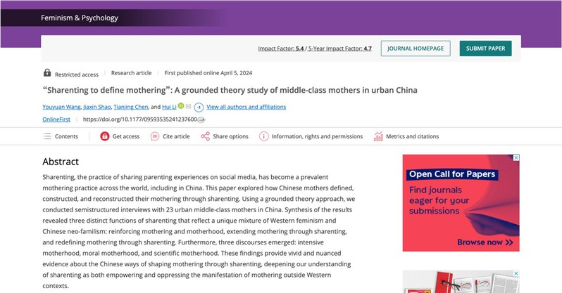 Wang, Y., Shao, J., Chen, T., & Li, H. (2024). “Sharenting to define mothering”: A grounded theory study of middle-class mothers in urban China. Feminism & Psychology, 09593535241237600. https://doi.org/10.1177/09593535241237600