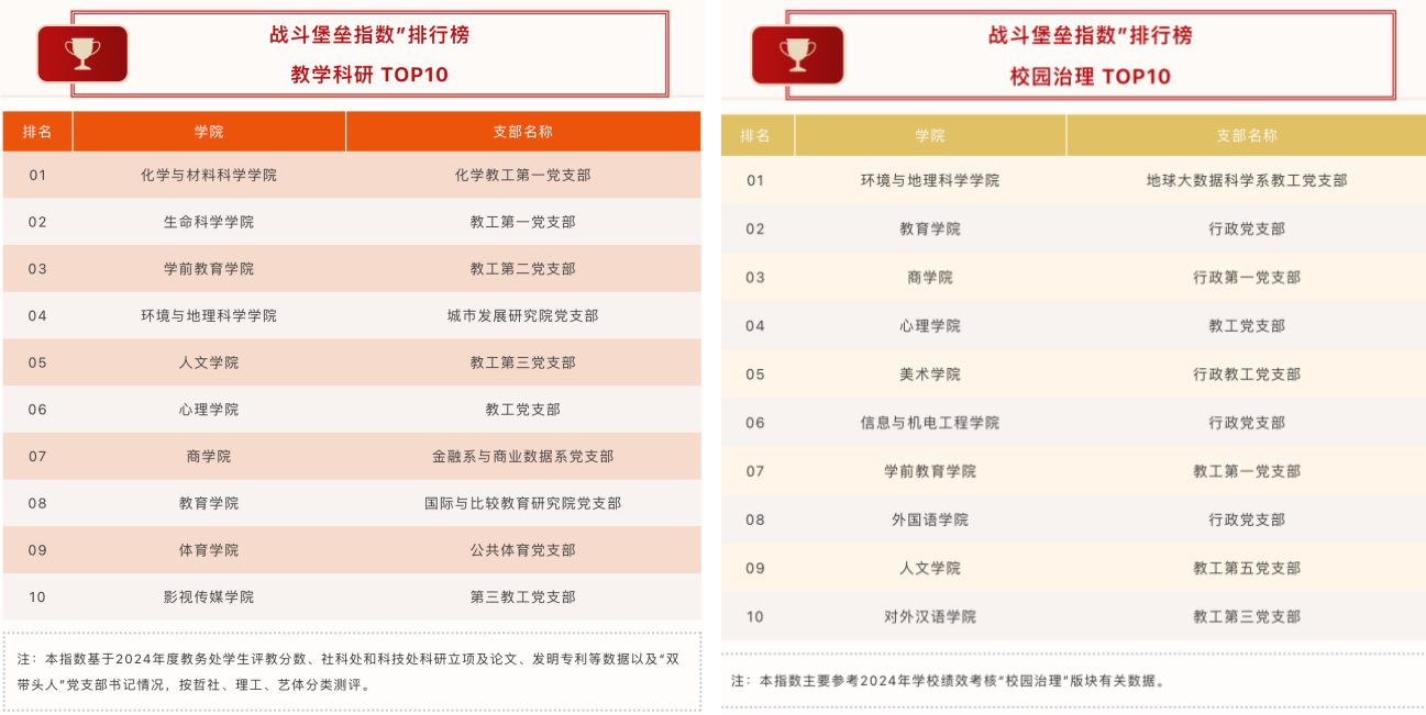 在此次排行榜中,學(xué)院教工第二黨支部在“教學(xué)科研TOP10”榜單中位列第三,充分展現(xiàn)了在教學(xué)科研方面的實(shí)力與貢獻(xiàn);教工第一黨支部在“校園治理TOP10”榜單中位居第七,彰顯了在校園治理工作中的作為與成效。