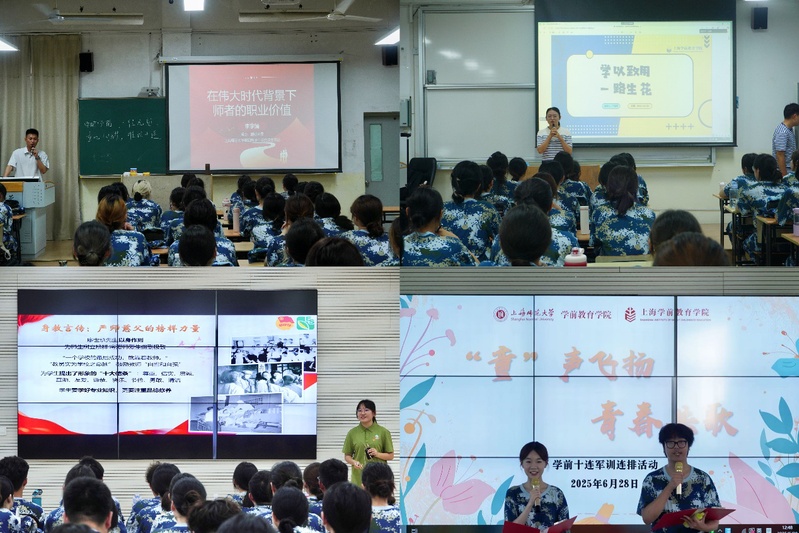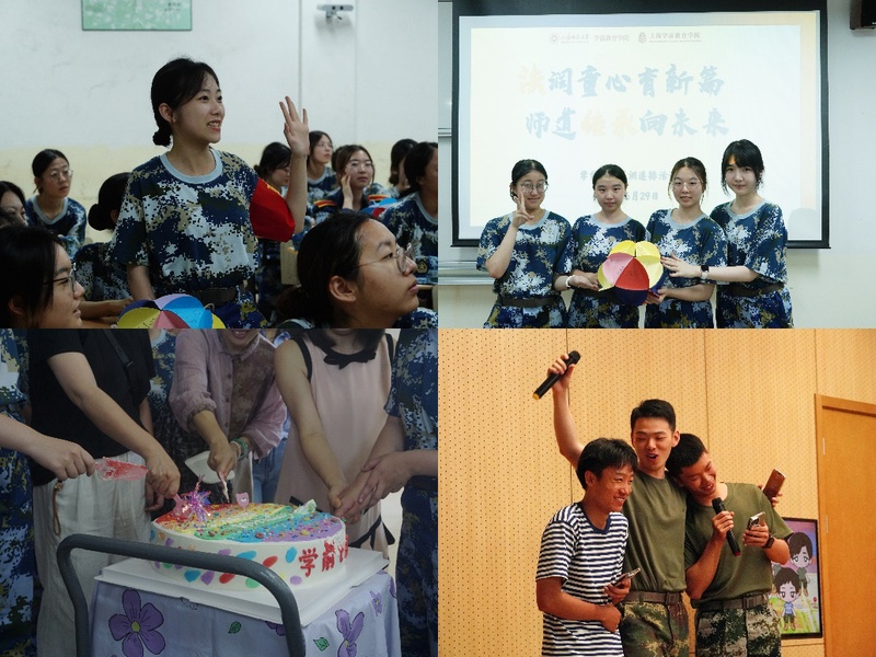 本次軍訓(xùn),學(xué)院策劃了豐富多彩的連排活動(dòng),將素質(zhì)教育、職業(yè)教育與軍訓(xùn)實(shí)踐相融。學(xué)院邀請(qǐng)上海師范大學(xué)第四附屬中學(xué)黨總支書記李宇靖,學(xué)院學(xué)生工作辦公室主任嚴(yán)雅琴等嘉賓,開展“名師進(jìn)軍營(yíng)”“生涯教育進(jìn)軍營(yíng)”等系列宣講活動(dòng)。組織“青春歌會(huì)暨集體生日會(huì)”,邀請(qǐng)學(xué)生家長(zhǎng)代表與全體學(xué)生共慶生日,展現(xiàn)青春風(fēng)采。舉辦“學(xué)前教育法知識(shí)競(jìng)賽”,將法治基因融入學(xué)前育人征途?!八徒坦偻頃?huì)”上,同學(xué)們以真切祝福,表達(dá)對(duì)教官的敬意與惜別之情。