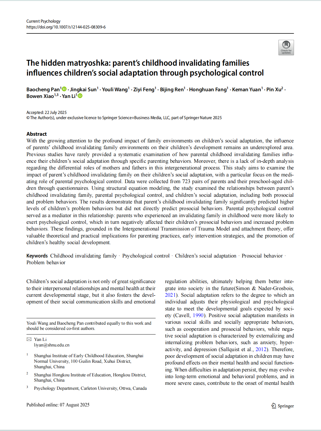 Pan, B., Sun, J., Wang, Y. et al. The hidden matryoshka: parent’s childhood invalidating families influences children’s social adaptation through psychological control. Curr Psychol (2025). https://doi.org/10.1007/s12144-025-08309-6