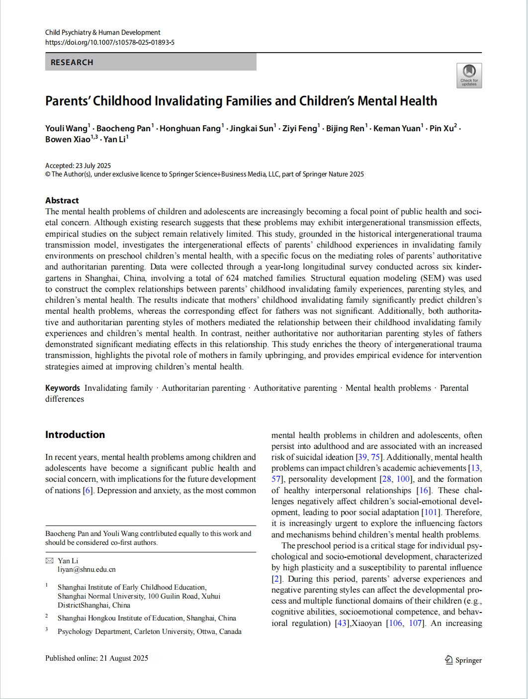 兩篇論文均以上海師范大學(xué)為第一署名單位,由博士研究生潘寶城、王由麗為共同第一作者,碩士研究生孫鏡凱、馮子懿、任碧菁、方虹歡以及博士后袁柯曼,許玭、肖博文等共同參與,李燕教授擔(dān)任通訊作者。成果發(fā)表于 Springer Nature 旗下國際權(quán)威期刊,其中 Current Psychology最新影響因子3.3,屬 JCR 心理學(xué) Q2 分區(qū);Child Psychiatry & Human Development最新影響因子2.9,屬 JCR 心理學(xué)/精神病學(xué) Q2 分區(qū)。兩個期刊均長期關(guān)注兒童心理發(fā)展、家庭教育與代際傳遞等前沿議題,具有廣泛國際影響力。此次連續(xù)發(fā)表,充分展示了中國學(xué)者在全球家庭教育和兒童發(fā)展研究領(lǐng)域的原創(chuàng)性貢獻(xiàn)和學(xué)術(shù)影響力。