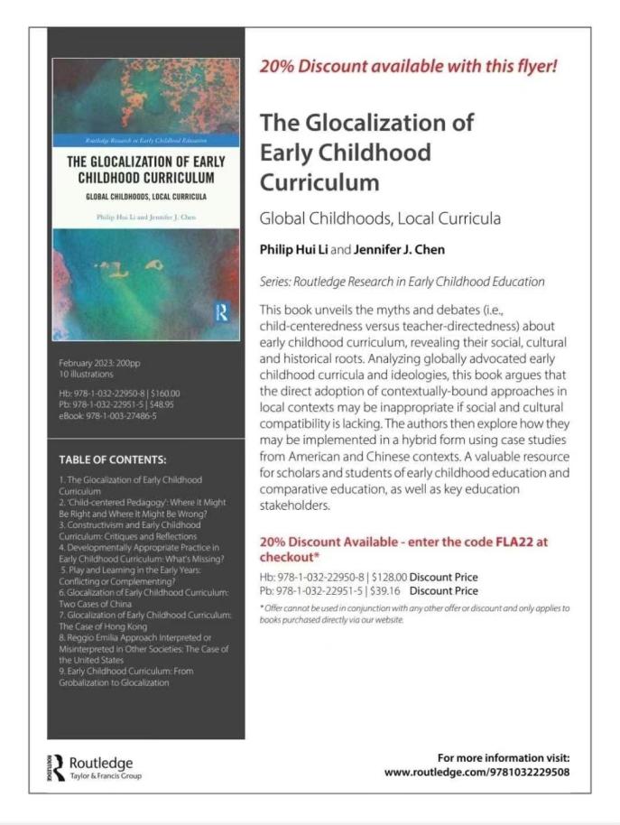 近日,我院李輝院長(zhǎng)與知名學(xué)前教育專家Jennifer J. Chen強(qiáng)強(qiáng)聯(lián)合出版的最新書籍《The Glocalization of Early Childhood Curriculum》(《幼兒課程的全球本地化》)由Routledge正式出版發(fā)行。本書通過(guò)實(shí)證和理論研究探討了幼兒課程的爭(zhēng)論(例如,以兒童為中心教師主導(dǎo)”),揭示了它們獨(dú)特的社會(huì)、文化和歷史根源。本書分析了全球倡導(dǎo)的幼兒課程和意識(shí)形態(tài),如發(fā)展適宜性教育實(shí)踐、以兒童為中心的方法、建構(gòu)主義和全球化的童年,認(rèn)為如果缺乏對(duì)當(dāng)?shù)?/span>社會(huì)和文化的關(guān)照,而將其生硬“移植”是不合適的。此外,作者提出了如何以混合形式實(shí)施幼兒課程。本書以中國(guó)大陸、香港特別行政區(qū)和美國(guó)案例研究為特色,為后真相時(shí)代幼兒課程研究和實(shí)踐的未來(lái)發(fā)展和重新部署提供了見(jiàn)解和建議。