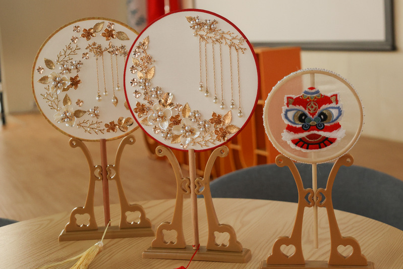 活動(dòng)開(kāi)始后,手作老師為大家介紹了團(tuán)扇的歷史背景和制作方法,帶大家欣賞了古色古香的成品團(tuán)扇。大家很快便迫不及待地拿起桌上的材料,開(kāi)始動(dòng)手制作。