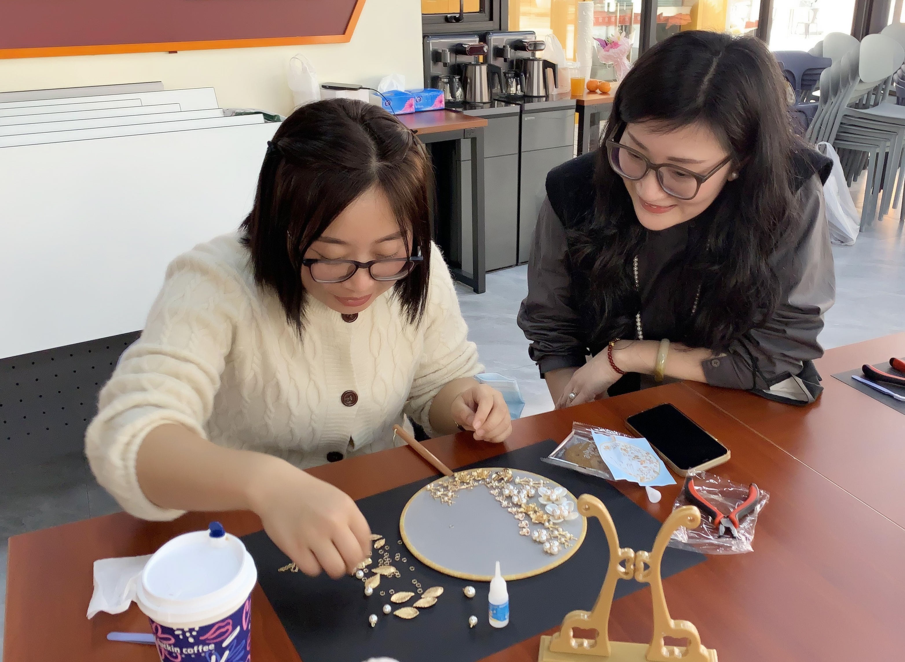 在手作老師的幫助下,大家選取自己喜歡的飾品,充分發(fā)揮個(gè)人創(chuàng)造力,在空白扇面上構(gòu)圖搭配,粘貼制作。通過(guò)巧手和想象,一柄柄或清新淡雅,或光彩閃耀的團(tuán)扇漸漸展現(xiàn),大家一邊交流制作心得,一邊互相欣賞著這些獨(dú)一無(wú)二的團(tuán)扇,現(xiàn)場(chǎng)一片歡聲笑語(yǔ)。制作完成后,老師們手持團(tuán)扇合影留念,盡顯知性之美。